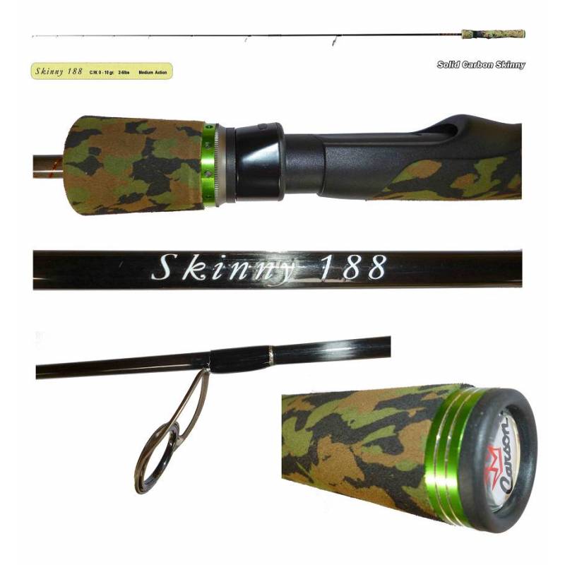 Fusto ultra sottile costruito interamente in carbonio pieno alto modulo, anelli in sic e manico in eva antiscivolo camo design.