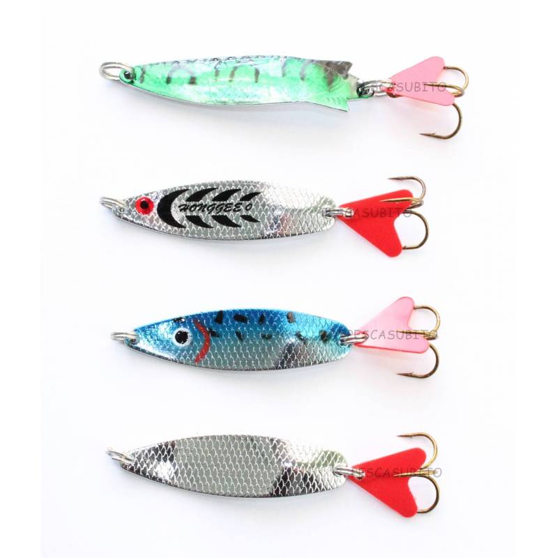 Ondulanti in metallo ideali per la pesca a traina e spinning. Ottimi per insidiare molte specie di pesce come: spigole, trote, aspi, sgombri, ecc.. Le colorazioni molto sgargianti con incisioni a forma di squame e la forma permettono a quste esche di muoversi e creare bagliori proprio come dei veri pesciolini. Vengono forniti di codina in plastica rossa che nasconde molto bene gli ami di tipo ancoretta.