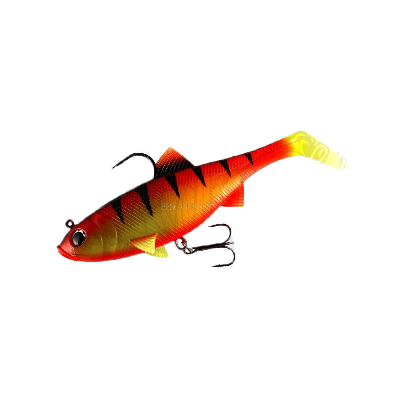 Nasce per la ricerca di grossi predatori come lucci, siluri e perca soprattutto se intendiamo cercarli in profondità. Con un affondamento di 1 metro al secondo è la soluzione che permette di farci divertire praticamente in tutte le stagioni dell’ anno. Escludendo l’ ancoretta in dotazione diviene letale se intendiamo addentrarci tra rami e vegetazione sommersa anche fino ai 15/17 metri di profondità. Il tipo di affondamento naturale riesce a provocare attacchi ancor prima d’ iniziare il recupero. Infatti su cinque catture fatte, ben due avvengono proprio in fase di calata. Dedicandola al luccio è da non sottovalutare la tipologia e grandezza dell’ occhio che ci han permesso di concretizzare il 70% degli inseguimenti in veri e propri attacchi. Diciotto centimetri per 90 gr.