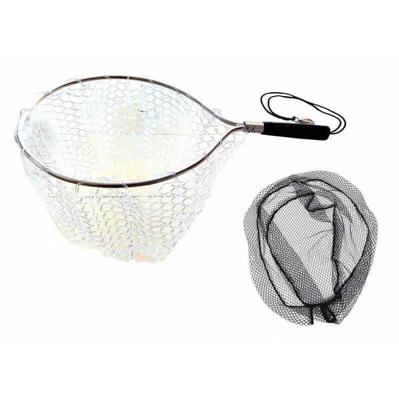 Guadino a racchetta ottimo per la pesca a spinning, mosca e trout area. La rete è in silicone, i principali vantaggi che offre questo tipo di rete sono: non arreca danni al pesce (indispensabile per chi pratica il No-Kill), gli ami e le ancorette non si incastrano sulla rete. Il telaio è in alluminio, manopola in gomma e laccio con moschettone da appendere sul gilet. Il punto di forza di questo guadino è la profondità della rete, in commercio si trovano molti guadini simili ma la maggioranza hanno la rete poco profonda, penalizzando di molto la guadinatura, infatti se la rete è poco profonda il pesce può uscire facilmente, ma non se si usa questo guadino.. ha una profondità di ben 40Cm!