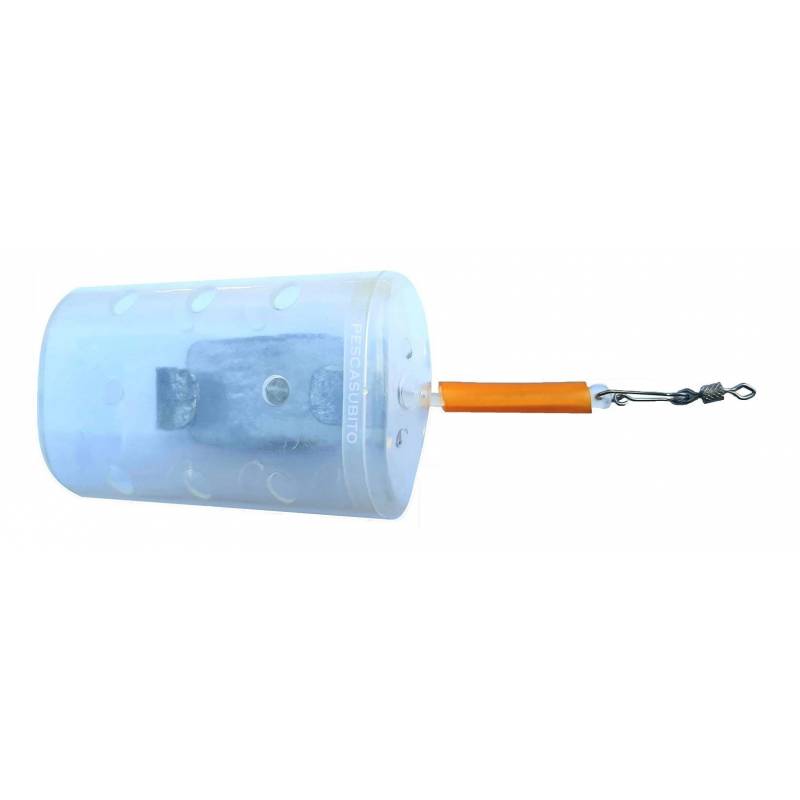 Pasturatore trasparente piombato ideale per bigattini, grazie alla sua forma piatta è indicato anche per la pesca in corrente. Viene fornito di girella con moschettone.